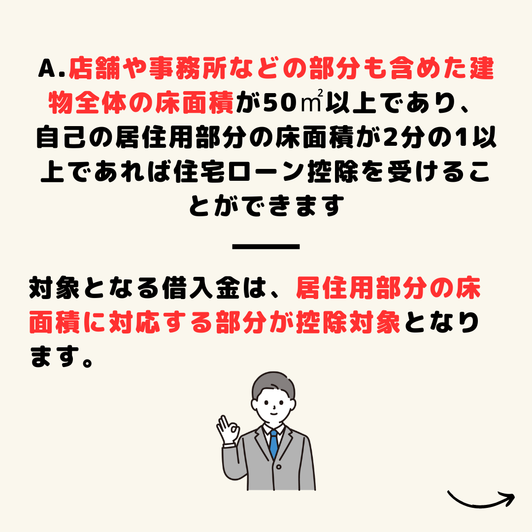 A.店舗や事務所などの部分も含めた建築物全体の床面積が50㎡以上であり、自己の居住用部分の床面積が2分の1以上であれば住宅ローン控除を受けることができます