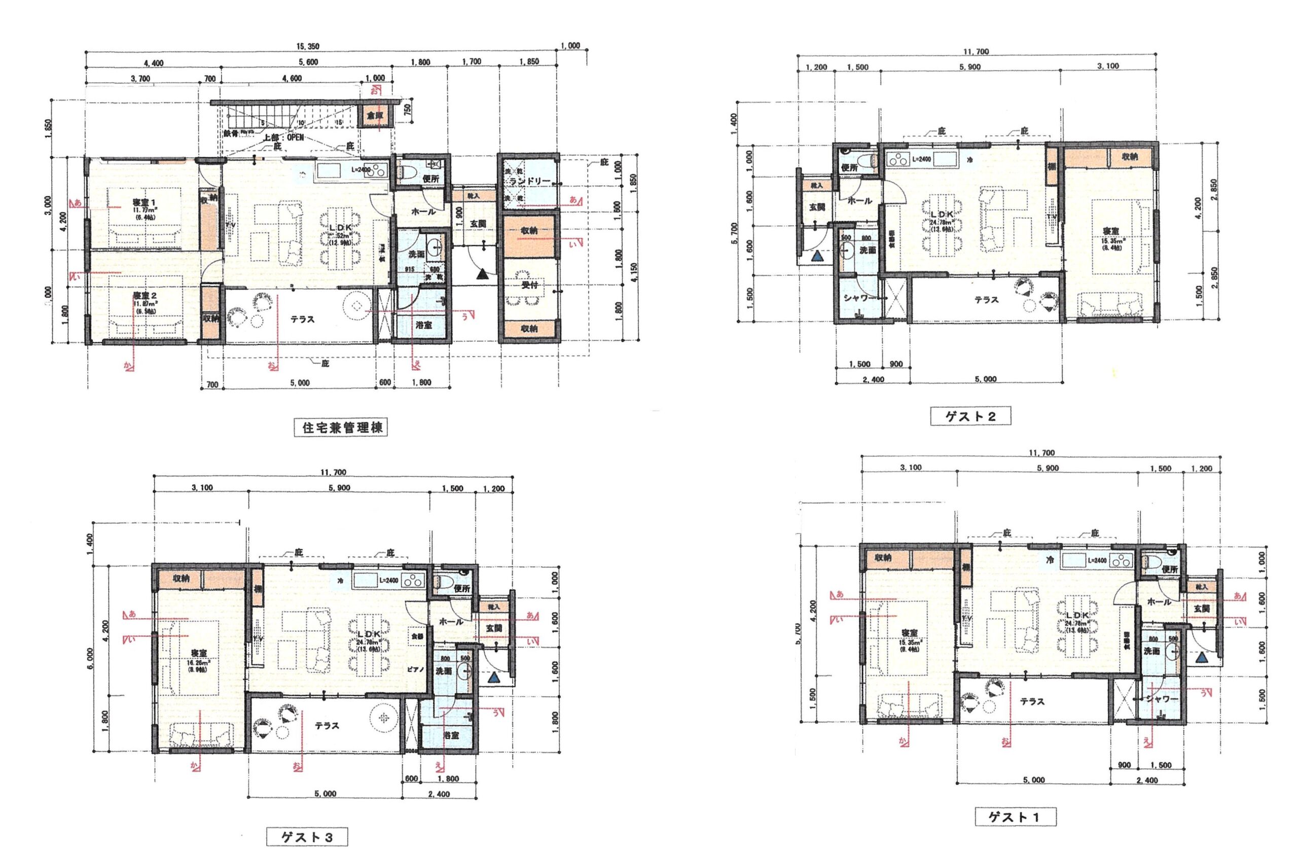 この物件は、現在旅館業として運営されており、4棟の平屋建ての建物で構成されています。3棟は1LDKの客室として、1棟は2LDKの間取りで管理棟として利用されています。